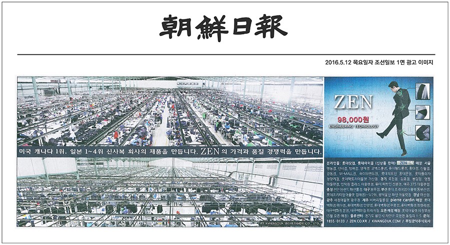 ZEN「젠」은 좋은 가격과 품질의 슈트를 많은 분들께 소개하고자 5월 12일 목요일자 조선일보 1면에 광고를 진행 했습니다. 이번 광고는 인도네시아 공장 사진을 중심으로 공장 전경과 우측에 2016년 S/S 시즌 선보이는 스트레치 원단으로 제작되어 신축성과 통기성, 형태 복원력이 뛰어난 98,000제품을 노출했습니다. 젠은 단순히 가격이 저렴한 제품이 아니라 직접 기획, 직접 생산, 직접 유통하는 구조를 통해 정직하고 뛰어난 품질, 합리적인 가격으로 선보입니다. 젠은 매 시즌 끊임 없는 연구개발을 통해 소비자들께 품질과 가격 모두를 만족시킬 수 있는 제품을 꾸준히 선보일 예정 입니다. 젠과 피에르가르뎅이 선보이는 슈트, 자켓, 팬츠 등 을 전국 젠 매장에서 만나보세요. 감사합니다.
