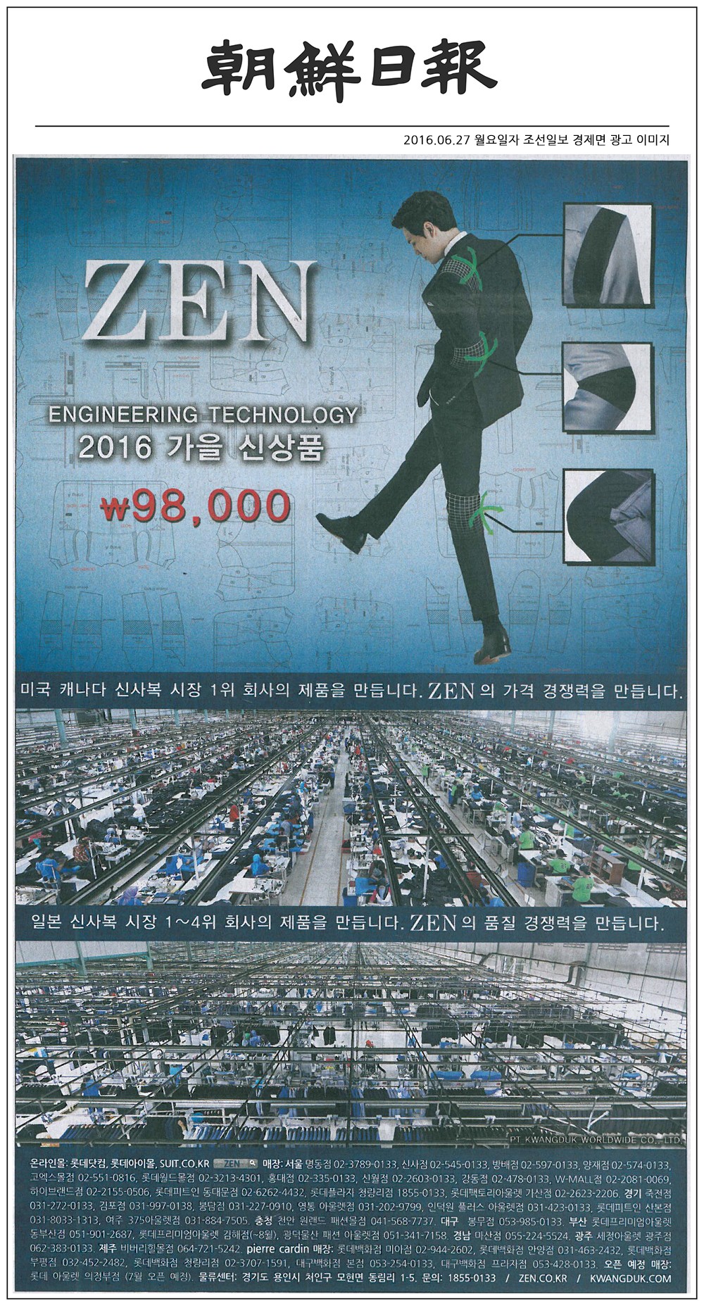 ZEN「젠」은 좋은 가격과 품질의 액션 수트(ENGINEERING TECHNOLOGY)를 많은 분들께 소개하고자 6월 27일 월요일자 조선일보 경제면 광고 진행 했습니다.