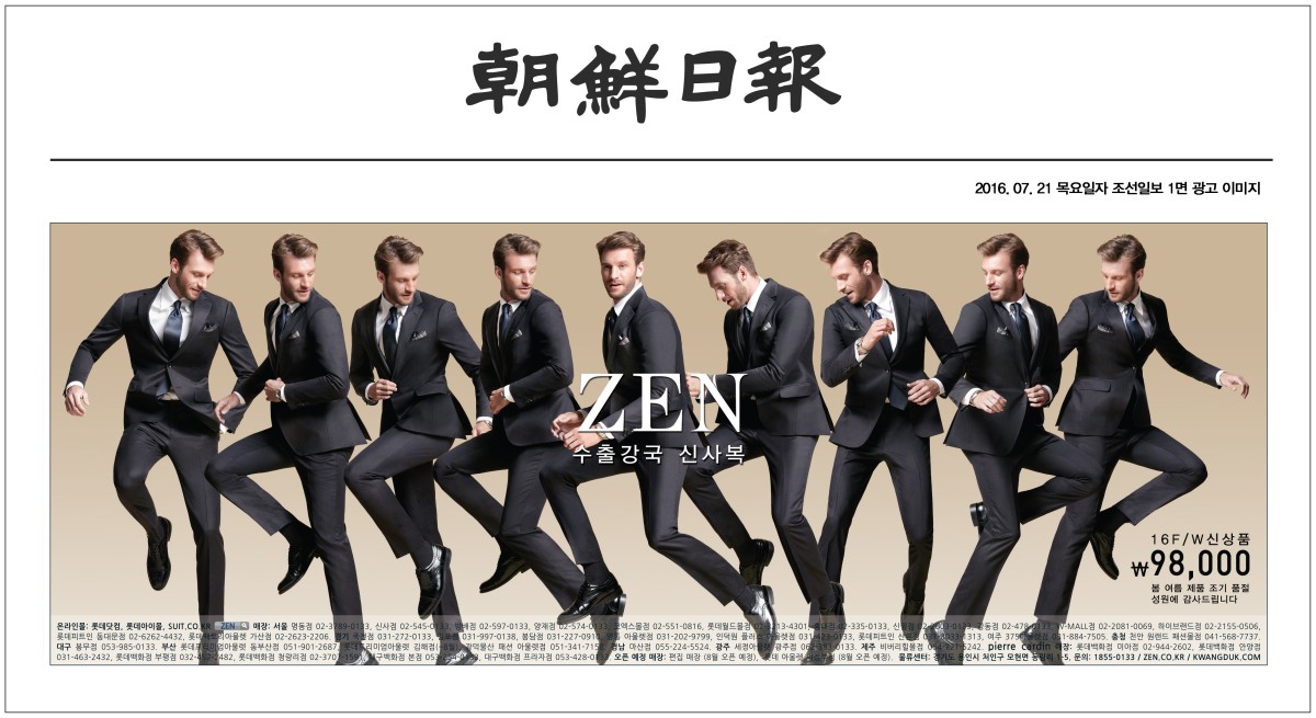 ZEN「젠」은 좋은 가격과 품질의 액션 수트(ENGINEERING TECHNOLOGY)를 많은 분들께 소개하고자 7월 21일 목요일자 조선일보 1면에 광고가 진행될 예정입니다.