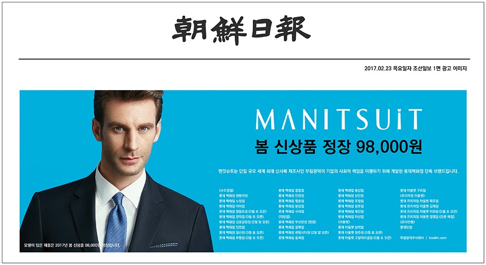 MANITSUIT「맨잇슈트」 2017년 02월 23일 조선일보1면 광고