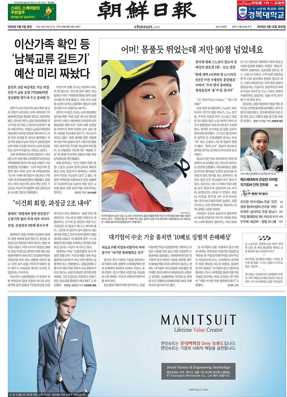 MANITSUIT「맨잇슈트」 2018년 2월 13일 조선일보 1면 광고